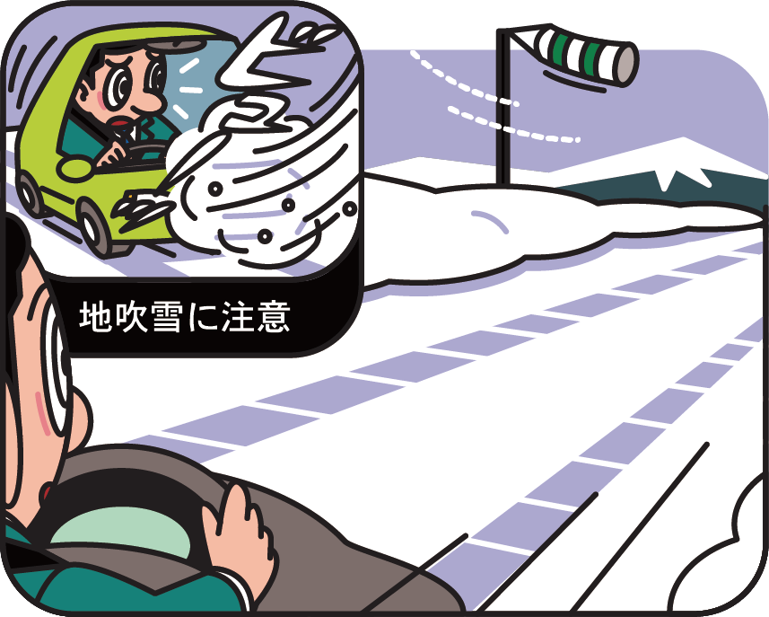 地吹雪とは、積もった雪が強風によって舞い上がる現象のことです。走行中に地吹雪に遭遇すると、ほとんど前方が見えなくなり(このような現象を「ホワイトアウト」といいます)、きわめて危険な状態となります。地吹雪は、風を遮る建物や樹木のない平坦な場所で発生しやすいため、そのような場所を走行するときは十分に注意しましょう。
