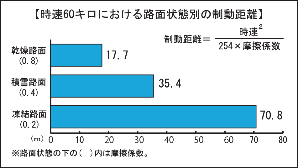 積雪路や凍結路は、ブレーキを踏んでもなかなか車は止まりません。これは制動距離(ブレーキが効き始めてから車が止まるまでの距離)が長くなるためです。制動距離は路面の状態に大きく左右され、路面とタイヤの摩擦係数が小さいほど長くなります。一般に、摩擦係数は乾燥路面が0.8程度であるのに対して、積雪路面は0.2~0.5、氷結路面は0.1~0.2といわれています。仮に乾燥路面の摩擦係数を0.8、積雪路面を0.4、氷結路面を0.2として、時速60キロの場合の制動距離を計算してみると、乾燥路面は17.7メートル、積雪路面は35.4メートル(乾燥路面の2倍)、氷結路面は70.8メートル(乾燥路面の4倍)となります(右図参照)。走行している路面の摩擦係数を正確に把握することは困難ですが、少なくとも積雪路面や氷結路面の制動距離は、自分が想定している距離よりも長くなる可能性が十分にあることを強く意識しておく必要があります。