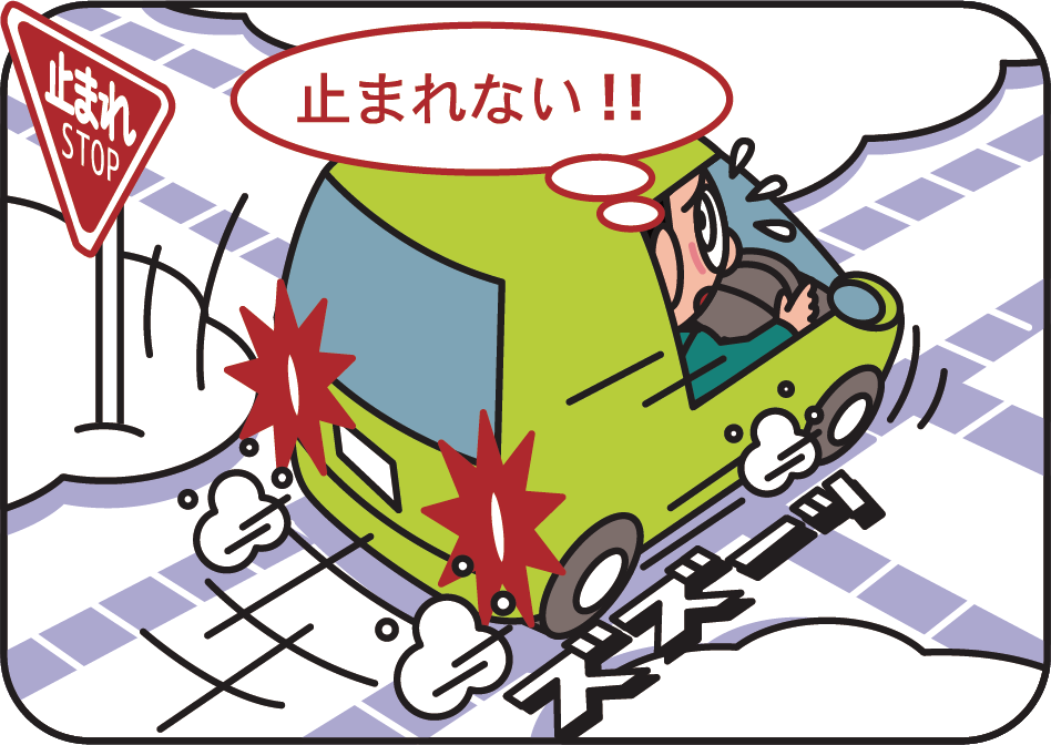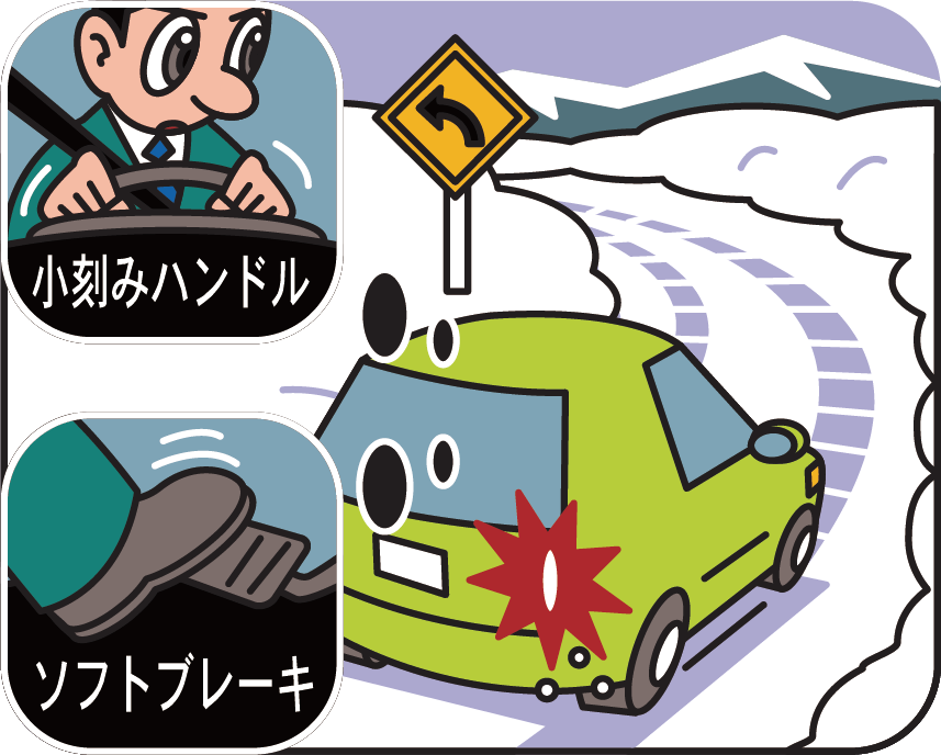 積雪路や凍結路を走行するとき、通常と同じ感覚で運転操作を行うとスリップを招く危険が高まります。積雪路や凍結路では、ハンドルは小刻みに切り、ブレーキはソフトに踏み、徐々に停止するようにしましょう。また、アクセルを強く踏み込むとスリップするおそれがありますので、ふんわりと踏み込むようにしましょう。