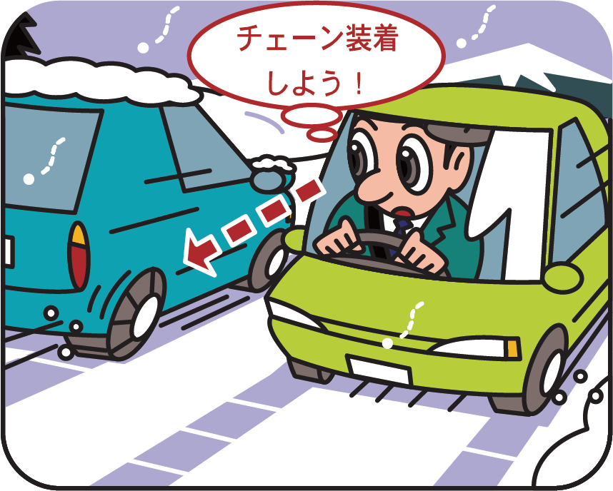 冬期の走行ではタイヤチェーンは必需品ですが、タイヤチェーンを携行していても、まだ大丈夫だろうと考えて装着が遅れ事故につながるケースが少なくありません。「チェーン装着」の指示が出されたときはもちろん、指示がなくても危険を感じたときや、対向車がタイヤチェーンを装着しているときなどは、早めに安全な場所に車を止めてタイヤチェーンを装着しましょう。